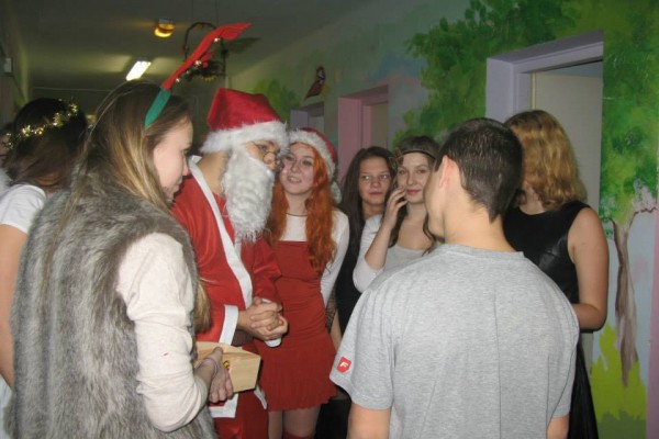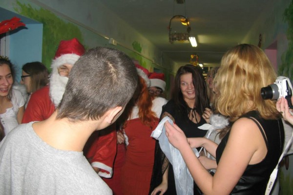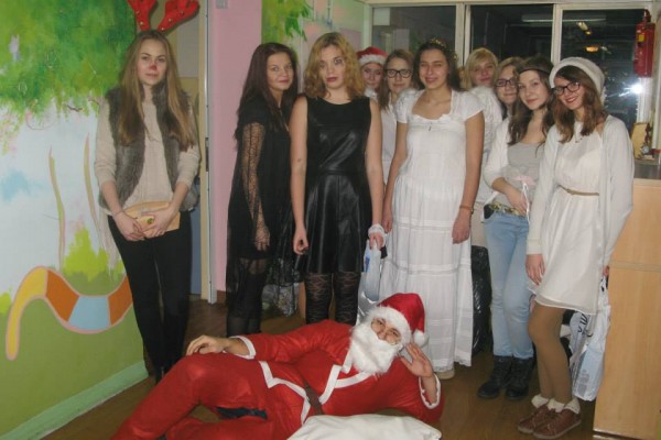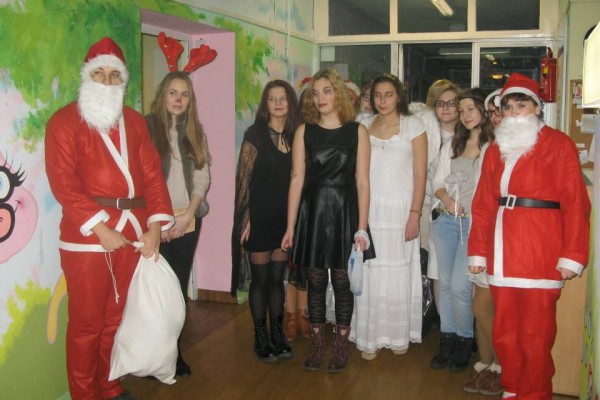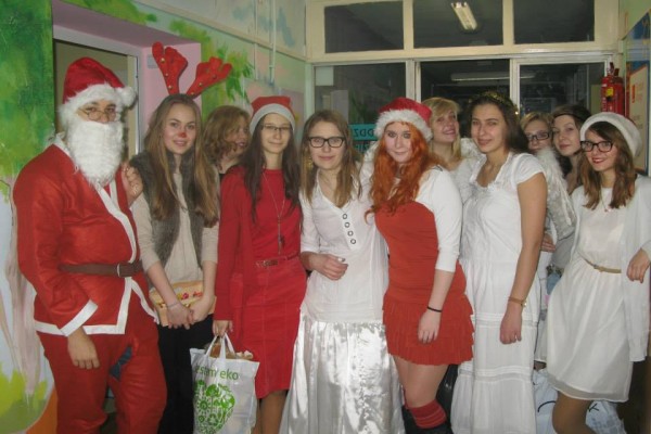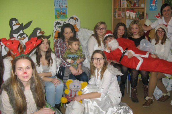 Następnie oddział odwiedziła grupa młodzieży z I Liceum Ogólnokształcącego im. Leona Kruczkowskiego w Tychach. Pod kierunkiem nauczycieli – Pani Małgorzaty Binias oraz Ruty Seidel uczniowie Kruczka w pięknych strojach rozdawali prezenty. Podarki były efektem zbiórki prowadzonej przez młodzież. Dzieci otrzymały lalki, samochody, klocki i wspaniałe pluszaki.